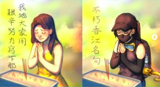 In some protest art, female figures are the sole main spectacle in the image, emerging from the background or a group of humans. Since these images theoretically embody the male gaze of the female figure, other women who view the images may begin to internalise the gaze and make themselves valuable in accordance with male expectations within the social setting. Is this scenario, this means embodying the strong and loyal protester and being an active participant within the urban environment. I do think there is something to be said about women, even me, being influenced by propaganda, which parallels the past history of China. Women in Hong Kong were colloquially referred to as 港女 (Hong Kong girl), the epitome of narcissistic, materialistic wealth-seeking. Female protesters now, however, were considered to be the best and bravest of Hong Kong. However, the male gaze remains at play since their social position directly relates to their role in the movement. In propaganda, they may be less sexualised, but they remain the model Hongkonger. Their labour in the movement is equated with their value.