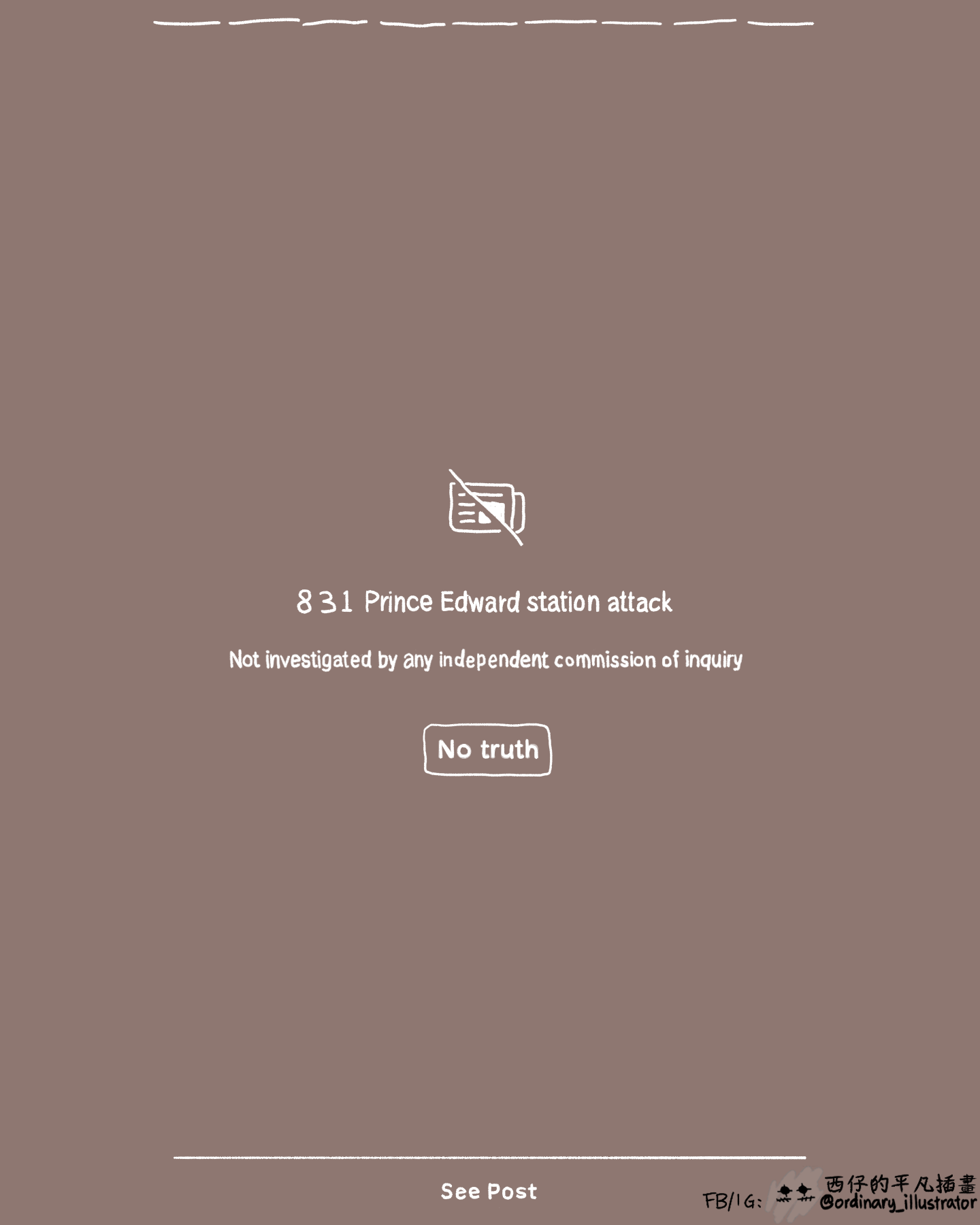 “831 Banned” refers to an incident on 31 August 2019 when the Hong Kong police attacked passengers on an MTR train while responding to a call at Prince Edward station in Hong Kong. The HKSAR government still refuses to hold an independent investigation into the incident.The police denied they attacked people, but livestream videos clearly showed otherwise. They also denied rumours people had died at the station and that they were colluding with the MTR to cover it up. CCTV footage from the night still has not been produced to dispel these rumours. Several months later, there were claims on Instagram that some live videos of the incident were fake. So I have used a reference to the fake news interface used on these Instagram posts, changing some words.