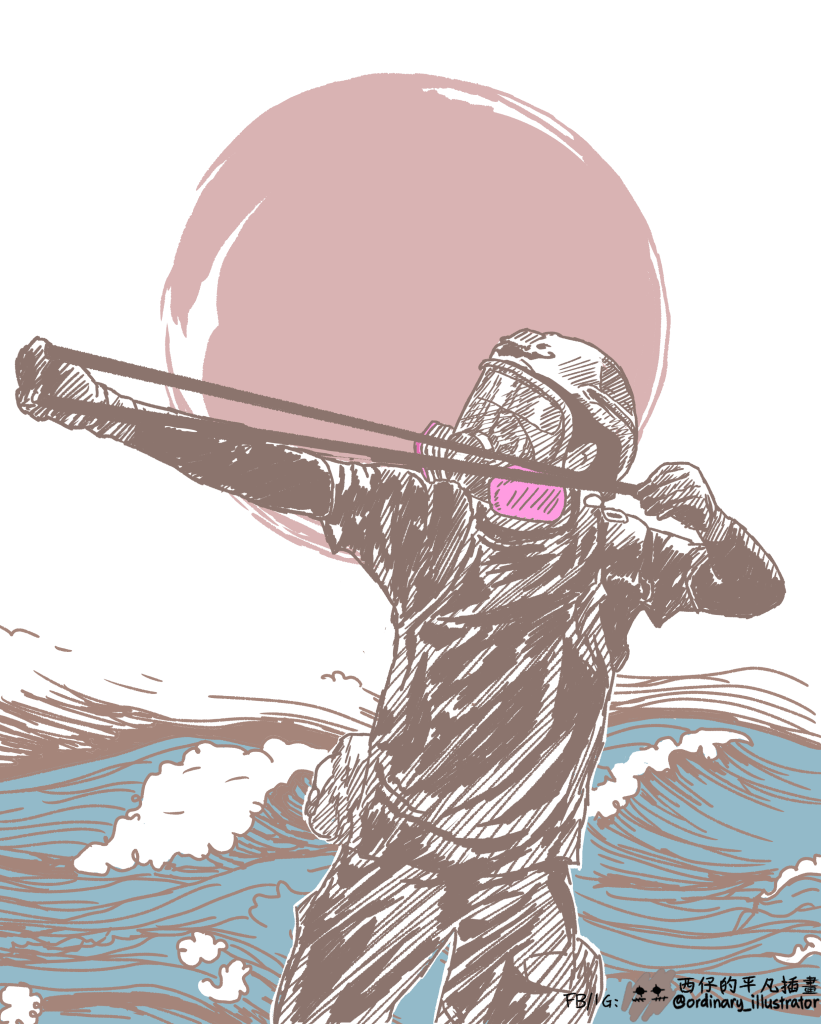 Hong Kong protesters face unequal force, Hong Kong police can use firearms, but Hong Kong protestors have only use homemade means to resist. Ukiyo-e elements are added to this painting