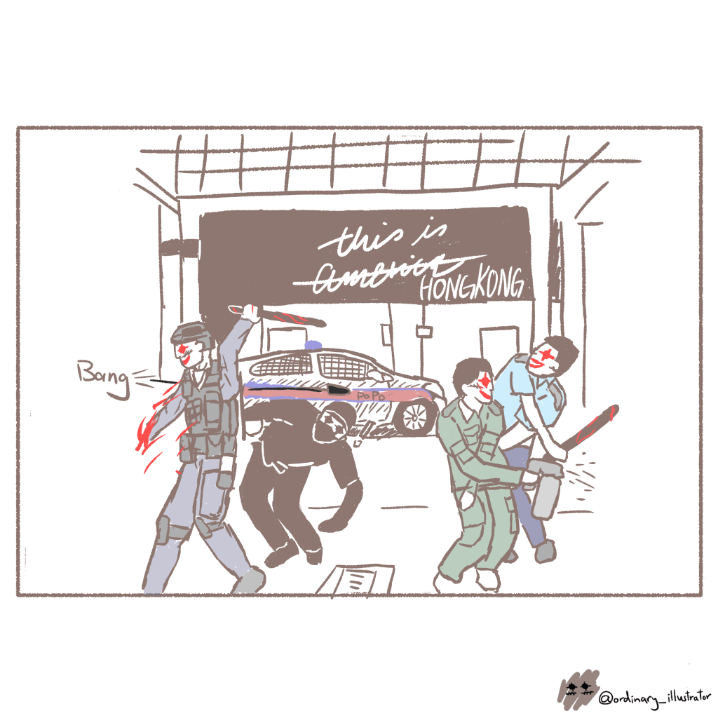 This is a reference to the music video of “This is America” by Childish Gambino. My work’s main message is to satirise the indiscriminate targeting of demonstrators by the Hong Kong police, and the general situation in Hong Kong.